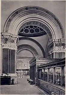A full-height partition separated the vestibule from the banking room at the time of the bank's opening. The partition was made of five full-height plates of French glass, decorated with sand-blown trimmings and separated by wood-and-marble columns.[23] This was subsequently replaced by a half-height partition, which appears in images from 1910.[24] The space had doorways on either side, leading to the corners of the banking room.[21][23] The Daily Times article described the space as having decorated massive oak doors with bronze finishing and glazed paneling.[23]