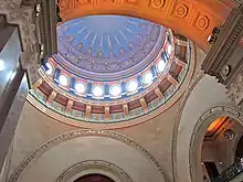 Beneath the dome, the oval windows of the drum illuminate the banking room.[17][27] The windows alternate with black pilasters designed in the Neo-Grec style, accented with red and gold decorations. The windows run above a band of ornaments and carved brackets, which are painted red, gold, green, and cream.[27] Above is a bronze and verd antique balustrade, which originally had 40 gas jets.[23][27] The gas jets were subsequently removed and a pipe rail installed in their place. A cornice runs just below the dome; it is painted black and accented in red and gold.[27] The dome itself is made of a double cast-iron shell and has a mural by P. B. Wight. The center of the mural is painted blue, with golden rays radiating from the top of the dome. The mural has a border with geometric, Neo-Grec, and floral designs.[10][27] The dome's height is variously cited as being 101 ft (31 m),[23] 110 ft (34 m),[27][29] or 115 ft (35 m).[10]