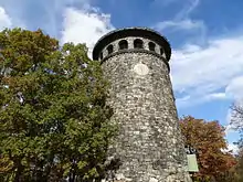 At the top of the hill is one of Wilmington's most iconic landmarks, Rockford Tower. The 115-foot tall stone structure, which was built between 1899 and 1901, serves as both a water tower and an observation tower as its top floor is an observation deck with large arching windows that provide a 360 degree view of the park and the city of Wilmington. The tower is directly across the river from the DuPont Experimental Station, where the company produced gunpowder in the early 20th century. Initially the city could not allow public access to the tower due to liability concerns over the risk of explosions from the gunpowder mills, but now the tower is open to park visitors in season.[11][12]