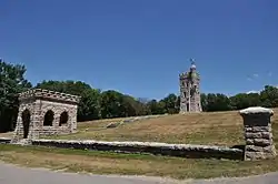 The Winchester Soldiers' Monument is located in a residential area north of the commercial Main Street area of Winsted, at the southern end of Crown Street. The park in which it is set is atop a circular hill, which is grassed down to the park drive, paths and a few trees dotting its interior. A low stone retaining wall lines the parking area on Crown Street. A square entrance arch with crenellated top provides access to one of the paths leading to the main monument. The main structure is a three-level tower built of ashlar granite from a local quarry, and is square in footprint. Its walls slope inward in the lower stage to eventually straighten and are crowned by crenellations. At one corner a circular tourelle projects from the third level, topped by a bronze figure of a soldier holding colors. There is a single entrance on one face, with single windows on each of the other first-floor facades, and two windows on each of the upper levels. The total height of the tower is 44 feet (13 m).[2]