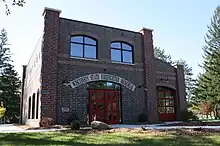 The centerpiece of the park is a statue of three life-sized firefighters engaged in a rescue situation.[8] One firefighter is dragging a disabled firefighter with another nearby ready to help. A memorial Final Alarm and Roll Call Ceremony is held each October to honor fallen firefighters in Wisconsin.[1] There are benches for reflection and the American flag flies over the park.[1] A tower with a firefighter's bell commemorates the bell that firefighters historically used to signal the beginning of a new shift and summon firefighters to an alarm and a fire call.[1] The memorial has a smaller bronze statue that it brings to funerals for firefighters who died in the line of duty.[9]