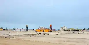 Wlotzkasbaken is not supplied with permanent electricity and not connected to the public water system. Water is delivered by road and stored in private water towers that gives a unique character to the settlement's skyline.[1] There are 106 houses which were all designed and built by their owners. Every household is self-sustaining with regards to water and electricity. Privacy is achieved by the large distances between the houses. There are no walls or fences; boundaries are demarcated with rocks. The village thus features a unique type of settlement in Namibia and has even received some international attention because of this.[2]