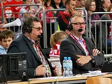 Wojciech Drzyzga and Tomasz Swędrowski as commentators during the 2014 Women's World Championship qualification in January at Atlas Arena, Łódź.