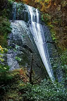 Wolf Creek Falls totals 125 ft (38 m) fall in two wide cascades and is the centerpiece attraction of the Wolf Creek Falls trailhead and Recreation Site.[1] A foot trail loops out and back for a total of approximately 2.3 mi (3.7 km) starting near Glide, Oregon. The first mile of the trail is wheelchair accessible with view points of the dense conifer forests.[2]