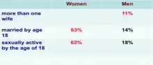 • 62% women and 18% of men age 25-49 were sexually active by the age of 18, i.e., Women start sexual activity about four and a half years earlier than men (median age of 16.6 years for women and 21.2 years for men) [4]