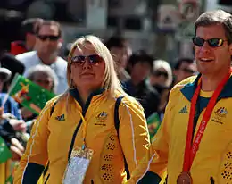 ![]() Melbourne homecoming parade for 2008 Olympic Team. Shooters, Stacy Roiall, women's trap, and bronze medalist Warren Potent, 50m Prone Rifle. | |