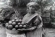 A Surinamese woman holding a basket full of fruits. Picture taken sometime within 1904–1937.