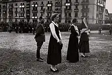 Spanish women supported the Republican war efforts behind the front lines. They made uniforms, worked in munitions factors, and served in women's corps similar to those organized by the US and British during World War I.[39] In Madrid, women would go in pairs to cafes around the city, collecting money to support in the war effort.[39] Many women on the Republican side joined JSU, serving in civilian roles near the front.[40]