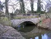 The River Dean marks the post-1974 county boundary between Cheshire and Greater Manchester. The A5102, Wilmslow Road, crosses the river at the Deanwater bridge. It was at the crossing that James Andrew of Compstall Bridge built the Dean Water calico printing mill in 1837, possibly on the site of an earlier calico printing mill.[12] Deanwater House was built as the manager's house. The mill closed in 1848. It was bought and resold to the Davenports on the conditions that it was demolished.[13] It was a sizeable concern employing 172 people, of which half lived in the parish of Woodford. It was driven by water with a supplementary 25 hp steam engine. It burnt down in 1851.