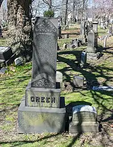 Prices for burial plots at the new cemetery ranged from $8 ($281 in 2022 dollars) to $400 ($14,070 in 2022 dollars).[27] The first burial at Woodland Cemetery was that of 15-month-old Fanny Langshaw on June 23, 1853.[28] A large number of monuments and mausoleums, many of which received high praise from The Plain Dealer for their aesthetic beauty, were erected in the cemetery in its first two years.[29]