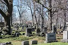 By the beginning of January 1852, the city had hired landscape architect H. H. Blackmore to survey the cemetery grounds.[6] Design work appeared to be complete by the end of February, at which time Blackmore was paid $40 ($1,407 in 2022 dollars) for his work.[7] The city council approved the sale of timber from the land in April in order to finance improvements,[1] and by July work on grading roads and pathways, platting, and landscaping were well under way.[8] A second landscape architect, Howard Daniels, was hired in October 1852 to complete the design of the cemetery. Paid $22 a day ($774 in 2022 dollars), Daniels employed a civil engineer, two drafters, and an assistant while working on the property.[1] Daniels designed Woodland to be a rural cemetery, with winding paths, plenty of trees, and room for monumental funerary monuments.[9][10][11][lower-alpha 3]