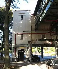 At the south end the platforms are open and lit by modern double lampposts. Just south of the island platform's end is a pyramid-roofed original signal tower. There are other signal towers and service rooms, faced in corrugated metal, south of the other platforms. A flagman's structure is beneath the north end of the island platform canopy.[6]