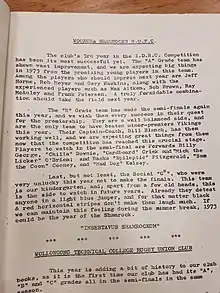 Shamrocks RUFC was founded in 1966 by the Corrimal YCW (Young Christian Workers who had originally been known as the Aurora club). In that year the Illawarra district Rugby Union extended an invitation to the Shamrocks to enter a team in the annual pre-season knock-out competition. The team strip consisted of a white guernsey with a huge red shamrock on the back, black shorts with red and white striped socks. Shamrocks won this knock-out and the IDRU subsequently invited them to play in the “C” Grade competition that year. Shamrocks went on to be 1966 Minor Premiers only to lose the Grand Final 3-0. They continued this success into 1967 - winning the Knock-out, minor premiership and the Grand Final to become premiers in only their second season. They retained the minor premiers tag in 1969, to make it three in a row, and though they missed out on a Grand Final that year they won promotion to B grade for the 1969 competition.