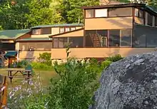 Located a quarter of a mile southwest along Drake Hill Road is Uphaus Lodge. Uphaus offers the most modern lodging quarters, and contains a library, nine guest rooms and laundry facilities. Adjacent to it are vegetable garden beds. Nearly a mile farther southwest, close to the southern entrance on Route 16, there is a cottage, a soccer field, and Weller House. This colonial-style house, purchased in 1958 but built in the early 19th century (c. 1820), is currently the oldest building on site since the demolition of the farmhouse. The primary parking lot is surrounded by several campsites, which provide the most economical lodging options. Just beyond the campsite area, there are the nature trails, which start out as one trail, diverging to the right after approximately a tenth of mile into a self-guided 1.25 mile loop with considerable elevation gain featuring 20 stopping points. The other trail, approximately .6 miles in length, leads directly to the swimming and boating areas of Whitton Pond, crossing two footbridges and is relatively even terrain. Whitton Pond, which covers approximately 164 acres (66 ha) and has a maximum of depth of 57 feet (17 m)[11] extends over the town border of Madison, has several islands and abuts numerous neighboring properties. At present the pond has very few settlements and is free of motor boats, making it a prime location for swimming, canoeing, kayaking, rowing, fishing, berry-picking and bird-watching. Throughout the summer, numerous other townsfolk and other non-guests make use of the trail on site and the swimming facilities.