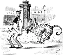 An illustration accompanying Punch's parody of Wormwood, "Germfood". The narrator, after eating a candied chestnut, hallucinates a yellow leopard which instructs him to write a book "to reform the world", written in English but sprinkled with sloppy French.