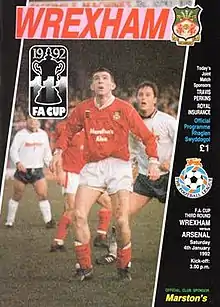 Both clubs met once previously in all competitions – an FA Cup quarter-final played on 11 March 1978 which Arsenal won by three goals to two.[7] Wrexham qualified for the third round of the 1991–92 FA Cup after beating Winsford United 5–2 in the first round and Telford 1–0 in the second round.[8] Arsenal, like the other top division clubs, entered the competition in the third round.[9] They went into the match as strong favourites; Vinnie Wright's pools forecast in The Times predicted an away win,[10] though Wrexham manager Brian Flynn noted: "On paper they should murder us, but the match isn't being played on paper."[6] Indeed, a match preview compiled by Times journalist Clive White warned against complacency for the visitors: "Wrexham are no push-overs at home and may be encouraged by the absence of Limpar, Wright and Bould in the Arsenal team."[11] Wrexham's precarious league position was covered in a The Guardian feature piece, which examined the feasibility of the club's ambitious redevelopment project. As part of a £42 million plan, Wrexham secretary David Rhodes proposed a new 5,000 all-seater stadium, while its Racecourse Ground would be converted into a supermarket.[6]