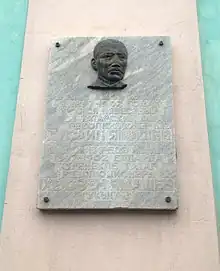 Memorial plaque on the building of the Tatar teacher's school where Khusain Yamashev studied
