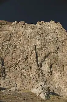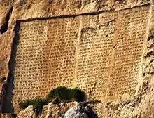 The Xerxes I inscription at Van, also known as the XV Achaemenid royal inscription,[1] is a trilingual cuneiform inscription of the Achaemenid King Xerxes I (r.486–465 BC).[2][3] It is located on the southern slope of a mountain adjacent to the Van Fortress, near Lake Van in present-day Turkey.[3] When inscribed it was located in the Achaemenid province of Armenia.[2] The inscription is inscribed on a smoothed section of the rock face near the fortress, approximately 20 metres (70 feet) above the ground. The niche was originally carved out by Xerxes' father, King Darius (r.522–486 BC), but he left the surface blank.[4][3]