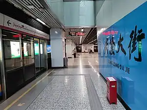 Xinglongdajie station (Chinese: 兴隆大街站), formerly known as Suojie station (Chinese: 所街站; pinyin: Suǒjiē Zhàn) during planning until 2007,[1] is a station of Line 2 of the Nanjing Metro. It started operations on 28 May 2010 along with the rest of Line 2.[2] The theme of this station's decorations is National Day.[3]