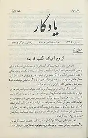 Yadgar (Persian: یادگار; DMG: Yādgār; English: "Monument") was a Persian-language journal published from 1944 to 1949 in a total of 50 issues in Teheran. Its editor was Abbas Eqbal Ashtiani (1896–1955), a Persian historian and nationalist.[1] The Yadgar journal specialised in literary and especially historical researches on Iran.[2]