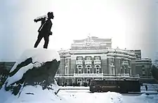 Snow-covered statue of Sverdlov in Yekaterinburg, formerly Sverdlovsk