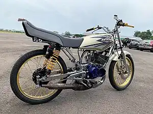 In Indonesia Yamaha RX King produced between 1983 and January 2009, so it's become legendary bike, especially in 2 stroke categories. Indonesian standard version of RX King can make 18,5 PS/9500rpm stock, with fuel efficiency around 35-40 km/liter of 88-octan premium. Because good availability of spare parts, and easy to maintain, until now RX King is one of the most wanted bike for two stroke speed lover, beside Kawasaki Ninja 150R/RR. Suzuki RGR 150, Satria 120 R or F-150, Shogun, Smash, Honda Supra X, Yamaha F1ZR Vega R, Jupiter Z, and Jupiter MX.