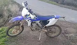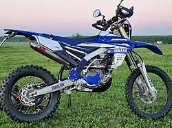 The Yamaha WR450F is an off-road motorcycle made by Yamaha Motor Company. It currently has a 450 cc (27 cu in) liquid-cooled single-cylinder engine. First offered in 1998 at 400cc, it shared many components and design concepts with the YZ400F motocross model. It is basically the racing YZ450F detuned slightly for more controllable power, with a headlight and lighting coil, softer suspension, a kickstand, lower noise specifications, larger radiators and lower emissions. The WR in the name indicates a wide-ratio gear box common to most enduro or trail bikes and stands in contrast to the close-ratio gearbox essential to a motocross racer. Over the years the WR has benefited from the advances made in the YZ motocross version gaining displacement and advancements such as an aluminum frame and improved suspension. Over much of its life the weight of the WR450F has remained fairly constant ranging from 244 to 249 pounds dry weight.[1]