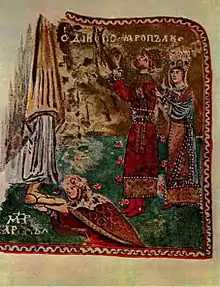Illumination in the Gertrude Psalter depicting Yaropolk and his wife before the Apostle Peter, with Yaropolk's mother Gertruda at the Apostle's feet.[6]