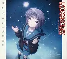 "Yasashii Bōkyaku" (優しい忘却, lit. "Tender Oblivion") is the eighth CD single containing 4 versions of the titular song by Minori Chihara. The single was used as the ending theme to The Disappearance of Haruhi Suzumiya,[1] in which Chihara again reprises her role as Yuki Nagato. It won the Best Singing Award at the fifth annual Seiyu Awards held in 2011 in Tokyo for Chihara's performance.[2] A promotional video for the song, filmed in the Haruhi Suzumiya franchise's real-world parallel setting of Nishinomiya-Kita Prefectural High School, was released January 27, 2010 on Lantis' official YouTube channel.[3]