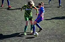 Yeliz Açar (right) of Fatih Vatan Spor challenging Merve Aladağ from Kireçburnu Spor in the 2017–18 Women's First League season.