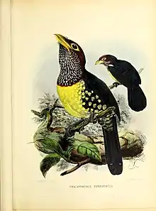 - ↑ BirdLife International. (2016). "Trachylaemus purpuratus". IUCN Red List of Threatened Species. 2016: e.T22725980A94907982. doi:10.2305/IUCN.UK.2016-3.RLTS.T22725980A94907982.en. Retrieved 27 October 2022.