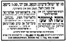 Another of the choir's early successes was its February 1926 performance of Schaefer's Tsvey brider ("Two brothers", based on a work by I. L. Peretz) to an audience of 4000 at the Mecca Temple.[7][11] Schaefer followed it with another successful oratorio, Di tsvelf (The twelve) which was performed at Carnegie Hall in April 1927.[7] The main choir often performed jointly with its affiliated choirs; its fifth jubilee concert at Carnegie Hall in April 1928 was staged together with a branch from Paterson, New Jersey which Schaefer also directed.[7][12]