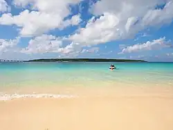 Yonaha Maehama (与那覇前浜ビーチ) is a popular bathing beach on Miyakojima Island in Miyakojima City, Okinawa Prefecture in Japan.[1] This seven kilometer white sandy beach is at the southwestern tip of Miyako Island.[2] Locals refer to it simply as "Maehama" (Maipama, Maibama), but in recent years it is often called Maehama Beach, with the English loan word added. In Miyako, "mai" means not only "front" but also "south", so the named Maehama may have been chosen because it is located in front and south of the island's Yonaha district.[3] Kurima Island is located opposite this beach, and the Kurima Ohashi Bridge connects the southeastern end of the beach to Kurima Island. On the slightly northwestern side of that bridge is Maehama Port, where boats used to arrive and depart from before the bridge was built.[4]