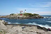 A number of spots throughout The Yorks have views of the Cape Neddick Light at Nubble Rock, which has figured in both artists' work and souvenirs of the Maine coast. A photo of the Cape Neddick Light is on the Voyager 1 spacecraft labeled as Seashore, Maine.[9] Visible in clear weather is the 133-foot (41-meter) tall Boon Island Light on Boon Island, located 6.2 miles (10.0 km) off York.