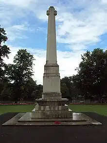 Of Portland stone construction, the memorial is in the form of a 33-foot (10-metre) high, lozenge-shaped shaft with short, chamfered arms, moulded where they meet the shaft to form a cross. The cross stands on a base of four uneven rectangular blocks, below which is an undercut square platform, which itself stands on two square blocks. At the very bottom are two wide, shallow steps. The largest block of the base bears the only inscription on the memorial: "TO THE CITIZENS OF YORK 1914 – 1918, 1939 – 1945" on the south face, and "THEIR NAME LIVETH FOR EVERMORE" on the north; the dates of the Second World War were added later.[1][5] As a memento, a bottle, several coins, and a newspaper were placed inside the structure.[8] The memorial stands in a war memorial garden on the south bank of the River Ouse; it overlooks the river and the ruins of St Mary's Abbey on the opposite bank.[1][9]