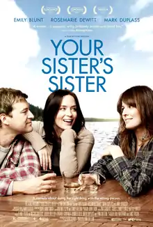 Your Sister's Sister is a 2011 American comedy-drama film written and directed by Lynn Shelton and starring Emily Blunt, Rosemarie DeWitt, and Mark Duplass.[4] The film premiered on September 11, 2011, at the Toronto International Film Festival, and was released in the United States on June 15, 2012.[5]