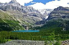 "Soon we came upon the western end of as beautiful a lake as I have ever seen. While showing neither glaciers nor snow upon the immediate peaks, the immense walls to the left and the cliffs and ideally pyramidal peak to the right formed a foreground of wonderful grandeur. The northwest end on which we stood fringed the emerald water with a growth of pine. The south east end facing us was encircled with cliffs five hundred feet in height, from whose summit, piled high with the rocks of an old moraine, three slender waterfalls leaped into the lake. This lake, about a mile in length and slightly less in width, I have known as Lake O'Hara. Ascending the cliffs upon our left by a gully we reached the glacial dam. The bed of an ancient glacier behind this is occupied by a very small lake, at the base of the sharp peak of which I spoke, and which I called by the Indian equivalent, Yukness."