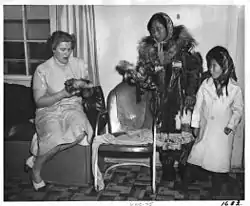 Yup'ik woman and her children with their fur dolls, which they offer for sale at the Bethel Roadhouse, 1949.