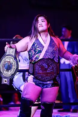 She also competed in the DDT Peter Pan branch of events. At Ryōgoku Peter Pan 2016 on August 28, she teamed up with Hyper Misao and Shoko Nakajima in a losing effort to Akane Miura, Miyu Yamashita and Yuka Sakazaki.[15] At Ryōgoku Peter Pan 2017 on August 20, she won a Rumble rules match for the Ironman Heavymetalweight Championship also involving Mizuki, her trainer Cherry, Yuna Manase, Maho Kurone and others.[16]
