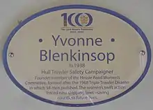 Blenkinsop lived in Hessle. Her daughter is a care worker and was present during the death of fellow headscarf revolutionary Mary Denness.[11] In May 2015 Blenkinsop, Denness, Bilocca and Jensen were honoured with plaques at the Hull Maritime Museum.[12] Also in 2015 Blenkinsop attended the launch of Brian Lavery's book The Headscarf Revolutionaries, a history of the 1968 safety campaign.[13] Blenkinsop was consulted by Maxine Peake during her research into the story for a 2017 play she wrote about the campaign.[14] In December 2018 Blenkinsop became only the third woman in more than 130 years to be granted the honorary freedom of the city of Hull.[1][15]