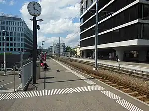 Adjacent stops are served by tram routes 5 and 13 of the Zürich tram network.[5][6]
