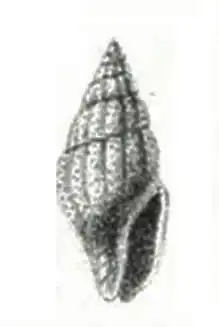 (Original description) The minute shell is ovate-fusiform. It is flesh-coloured, everywhere minutely dotted with red and marked with an indistinct pale line around the middle of the body whorl. The shell contain seven whorls, the three apical whorls smooth and convex; the rest somewhat gradated, flat at the sides, very strongly longitudinally costate. The twelve ribs are continuous up the spire, rounded and thick. Their upper end is crossed by a shallow groove, giving the whorls a margined appearance. The body whorl is convex at the middle, somewhat contracted below, transversely grooved at the base, with the ribs less strongly developed as the outer lip is approached. The aperture is very small and narrow, only slightly contracted into a short oblique siphonal canal. The outer lip is distinctly sinuated below the suture and thickened within. The columella is rounded, prominent at the middle, and covered with a callus.[2]