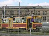 During the year following the liberation of the city from the German troops, work continued on the restoration of the tram system.[10] In the months following the war, 35 km of track and contact network were rebuilt, a traction substation was put into operation, and 10 wagons were repaired. 10 wagons each were received from Kyiv and Kharkiv. In October 1944, the launch of the first line took place with trams operating on two routes.[11]