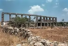 Seven inscriptions have been found in Zarzita, six of which note the structure's proprietor and the architect.[4] Of the buildings that remain, archaeologists note a church, tower, and some houses.[3] The single-nave church dates to the sixth century and has higher, narrower proportions compared to others in the region.[3] The nave looks southwest and retains a rectangular sanctuary.[1] There is one west entrance and two on either side wall (north and south). It has a square presbyterium and oblong side chambers. The columns and arches are lost.[3]