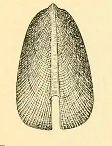 (Original description) The small shell is translucent white, depressed, wider in front, narrow behind, squarish at both ends. The incurved apex terminal is behind. The slit is short, one-fourth as long as the shell, widest in front, straight. The fasciole is depressed, with an elevated keel on each side. The sculpture consists of fine concentric incremental lines and very fine elevated threads, which start from the anal fasciole and curve outward toward the margin with very few intercalated threads. The margin is smooth, the interior polished, the fasciole is convex inward. The front margin is twice as wide as the posterior margin. [3]