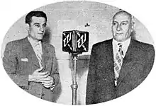 Díaz (right) with his son Oscar in a radio broadcast to commemorate Rosario Central's 50th. anniversary, 1949