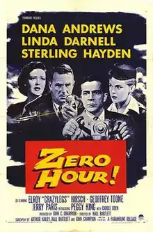 Zero Hour! is a 1957 American drama film directed by Hall Bartlett from a screenplay by Bartlett, Arthur Hailey, and John Champion. It stars Dana Andrews, Linda Darnell, and Sterling Hayden and features Peggy King, Elroy "Crazy Legs" Hirsch, Geoffrey Toone, and Jerry Paris in supporting roles. It was released by Paramount Pictures.[3]