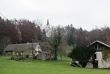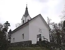 The local church, built on Mount Saint Mary Magdalene, is dedicated to Saint Mary Magdalene and belongs to the Parish of Šmarje-Sap. In its core it is a 15th-century Gothic building that was restyled and vaulted in the late 17th century.[9] The church is built on top of the ruins of an extensive prehistoric fortification. The altar furnishings in the church mainly date from the 19th century,[5] but include a 17th-century chalice.[8] The first structure at the site was a chapel built in the rural Gothic style, and the church was first mentioned in written sources in 1663.[7] The church has three Baroque altars. The main altar is dedicated to Saint Mary Magdalene, and a painting of the saint by an unknown artist, dating from the mid-17th century, hangs on the right side of the nave. The north side altar is dedicated to Saint John of Nepomuk and Saint Apollonia. A painting of Mary Immaculate by Štefan Šubic hangs on the north side. The south side altar is dedicated to Saints Cosmas and Damian.[8]