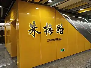 Zhumei Road (Chinese: 朱梅路; pinyin: Zhūméi Lù) is a metro station on the Line 15 of the Shanghai Metro. Located at the intersection of Laohumin Road and Zhumei Road on the border between Xuhui District and Minhang district, Shanghai, the station was scheduled to open with the rest of Line 15 by the end of 2020.[1] However, the station eventually opened on 23 January 2021 following a one-month postponement.[2] The station is located between Luoxiu Road to the north and West Huajing to the south.