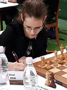 Zsóka Gaál (born 2 May 2007) is a Hungarian chess player who holds the title of Woman International Master (WIM). She was the 2021 online World Youth Champion in the under-14 girls' division.[1] She had finished runner-up to Eline Roebers a year earlier.[2] She was also a European Youth Champion in 2016 in the under-10 girls' division.[3] Gaál earned the Woman International Master title in 2021 at 14 years and 2 months old.[4] Her coaches are Gábor Papp and Tamás Bánusz, both of whom hold the title of Grandmaster (GM) and are also from Hungary.[5]